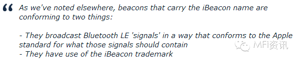 就像蘋果需要廠商通過“Made-for-iPhone”品牌認證一樣,公司現在也需要廠商在滿足iBeacons標準的情況下才能通過蘋果認證,有點類似蘋果設備的配件和硬件產品?,F在看起來,iBeacons認證計劃與主要的藍牙MFi認證是相互獨立的,藍牙MFi認證主要針對消費級藍牙產品外設。這項改變也意味著廠商需要通過蘋果MFi渠道才能獲得在產品上使用iBeacons品牌的允許,而且還要滿足一些特定的標準。